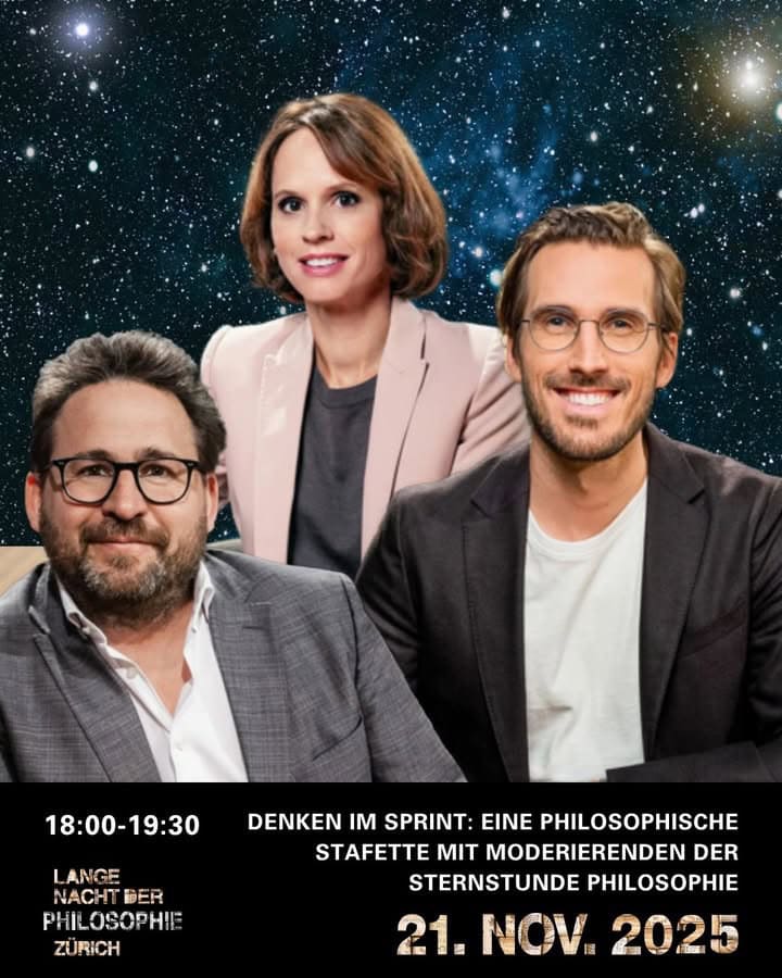 Drei auf einer Bühne, eine gute Stunde Zeit und die grossen und kleinen Fragen des Lebens: Bei dieser philosophischen Stafette im Rahmen der “Langen Nacht der Philosophie” werfen sich die Moderierenden der Sternstunde Philosophie Barbara Bleisch, Wolfram Eilenberger und Yves Bossart Denkanstösse und Fragebälle zu, mal tiefgründig, mal persönlich, mal mit Humor – aber immer ohne Skript. Eintritt frei.